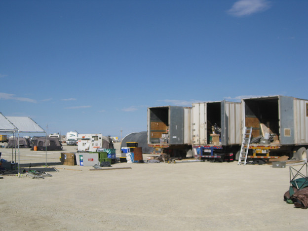We arrived at Fernley, Nevada that evening and did our final stocking up at Wal-Mart. We grabbed showers at the Love's truck stop and had our last restaurant meal of steak at a Casino restaurant. We parked at the truck stop and spent the night. Friday morning before dawn we headed north toward Burning Man. We watched a pretty sunrise over the Black Rock Desert as we approached the event. We met the greeters and found our way to the location of Darrell's camp. We found the guy in charge of placement pretty easily, which I thought would be an exercise in futility. We unloaded all of his camp's gear and then drove me across the event to the Automatic Subconscious site, where my campmates were already 2 days into their setup.