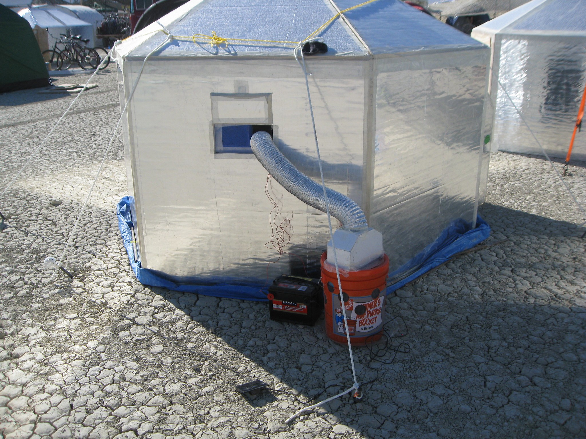 Saturday it was cloudy all morning with some sprinkles of rain. This meant less sun and lower temperatures, which was great for me. We set up the evap pond, which is called "Lake Woodward" and pronounced "Lake Woodwood" by the Bostonites. I helped build the shower and then re-arranged the coolers in the kitchen. I tried to get my swamp cooler going in the afternoon (I later heard that it hit 112 degrees Saturday afternoon once the clouds blew over). However, it hit my first major snag in that my 12v battery seemed to have leaked some sulfuric acid during the trip (maybe altitude issues???). It was a frigging mess. It burned holes in some of my clothes and gear. Luckily it was well-contained in my tarp and I had enough excess tarp to wrap it up and fold it out of the way. The second major annoyance was the fact that the rubber boots I had bought at Goodwill didn't fit properly and were giving me bad abrasions on my ankles and calves and threatening to blister my feet. This was bad news as the only other footwear I had was flip-flops. I also didn't have proper knee-high boot socks. I don't really have any experience wearing boots. So this was a problem that I would battle over the next few days. One of our campers made a run to Gerlach that day and I asked him to pick up some boot socks for me, but that run took all day and he returned with a single pair. By the end of the day my feet were aching both from the poor-fitting boots as well as just general hurting from so much standing, walking, and lifting. Saturday evening I washed my pants, which were already filthy and stained, in some meltwater. They also had some acid on them I was trying to mitigate, but it had already burned a few small holes here and there.