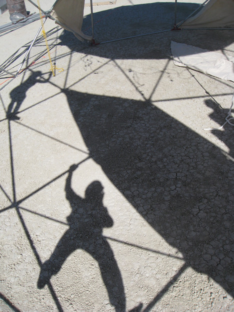 Sunday morning I unloaded gear from the shipping containers AutoSub sends from Boston to the playa. I ended up trimming the tops off of my boots, which solved the abrasion problem, but by this time I already had a few open wounds that would just sit there and not heal until I got off the playa. We carried Phil's aerial rig out to the playa across the Esplanade from AutoSub. I strung a bunch of Christmas lights up in the AutoSub dinning hall with Ayer from Camp Cwality. Let it be known that I hate Christmas lights and rope lights should always be used in their stead. In the afternoon we started the top layers of the AutoSub dome build. We had rice, beans, and salad for dinner and heard some welcome speeches as early crew officially ended.