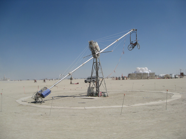 Tuesday night I danced in the AutoSub dome where Encanti was deejaying. I rode out to the Go Fly A Bike installation. This is a gigantic rig that spins a long post. One end of the post dangles a bicycle, and the other has water barrels that serve as ballast (in theory). The rider pedals the bike around a circular path and then eventually gets lifted up off the ground to 15 feet into the air. The design involves complex pumps and switches, but they ran into a bunch of technical difficulties with that and ended up just having someone hang off the other end to lift the rider up.