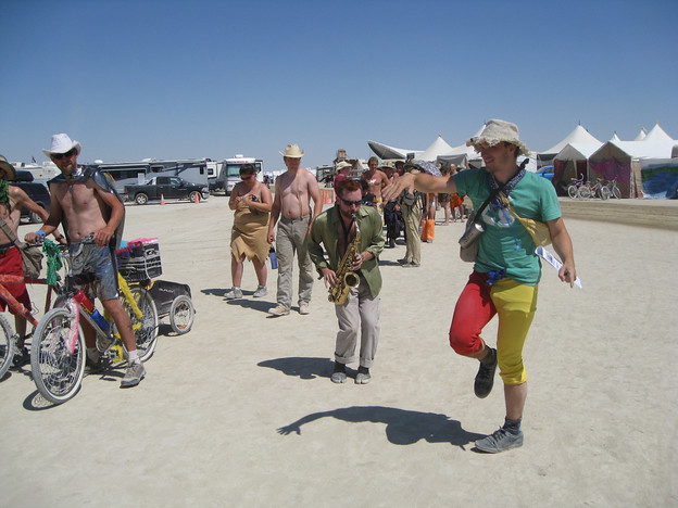 I rested a bit and then had our dinner of franks and beans. I rode around looking for a funk jam session at Bandlands but couldn't find it. This is what happens about 75% of the time when you set out looking for some specific thing at Burning Man. I rode out to the deep playa and played some sax by one of the sculptures. I played some jazz ballads and some classical noodling. People would stop by and listen for a while. One woman in particular stayed a very long time listening to the lyrical classical noodling. Most of the day Wednesday I wasn't feeling well, which is really not what you want when you're in the desert dealing with sweltering-hot port-a-potties that are 3 blocks away.