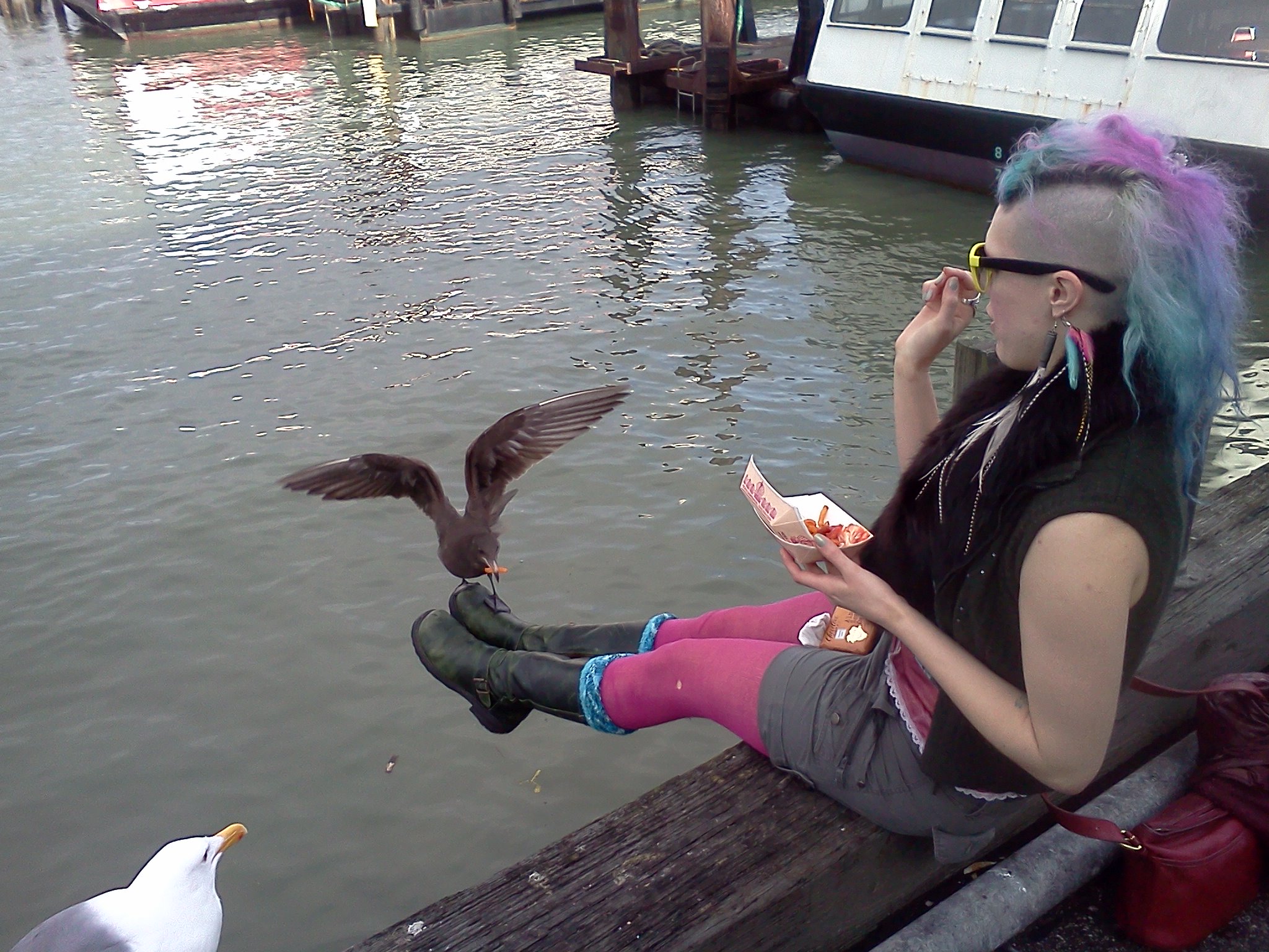 Then we wondered north along Montgomery and up some great stairs here and there, eventually hitting Coit Tower. Then down the Filbert Steps listening to parrots squaking. We went out to the Embarcadero and walked all along Fisherman's Warf. We stopped for some seafood lunch and Tess fed some seagulls off her feet.