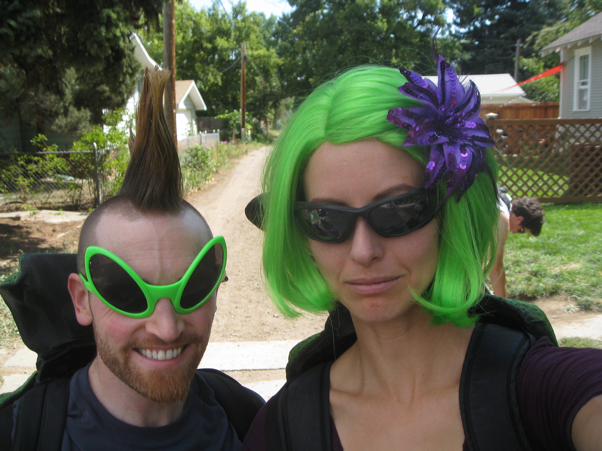 I had been tweeting back and forth with my Twitterverse Doppelgänger @rockstar_ who lives up in Fort Collins about the logistics. Plan was to park in his driveway which is close to the parade route. However, we didn't arrive in the neighborhood until after 11 AM and streets were crowded with bikers and closed to cars, so we just found a spot where we could squeeze in behind another car by driving up under their bike rack and having our bike rack sticking slightly into an alley a bit. Jasmine had already put on her eye makeup in the moving car, which I found to be both impressive and risky. Jasmine had two giant foam-rubber beetle shells you wear like a backpack, so we suited up in those and Jasmine helped me erect the mohawk, which as you will see below, is pretty damned long these days after more than a year of growth.