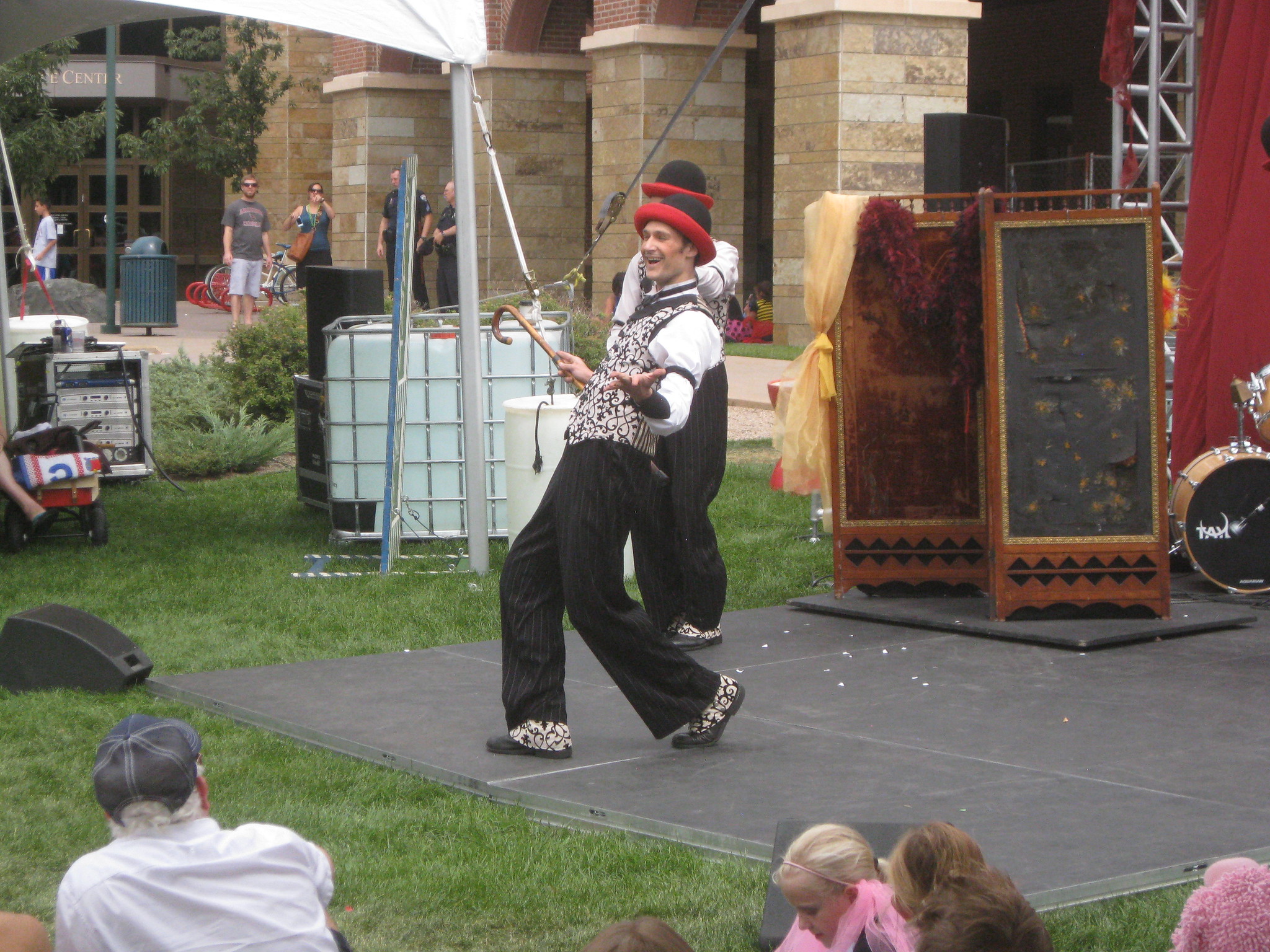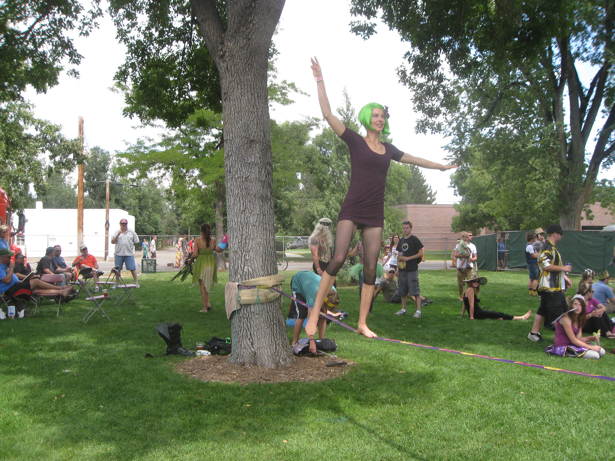 We turned quite a few heads, drawing a lot of comments on Jasmine's amazing superhero boots, our beetle shells, and my hair. We found a slack line where Jasmine played for a bit, then wondered over to the side stage, where a juggling performance by The Handsome Little Devils was about to begin. While we waited for the show, Alex spotted my hair in the crowd and came to hang out with us. The show was great, with some good juggling acts, well-made costumes, and really funny antics.