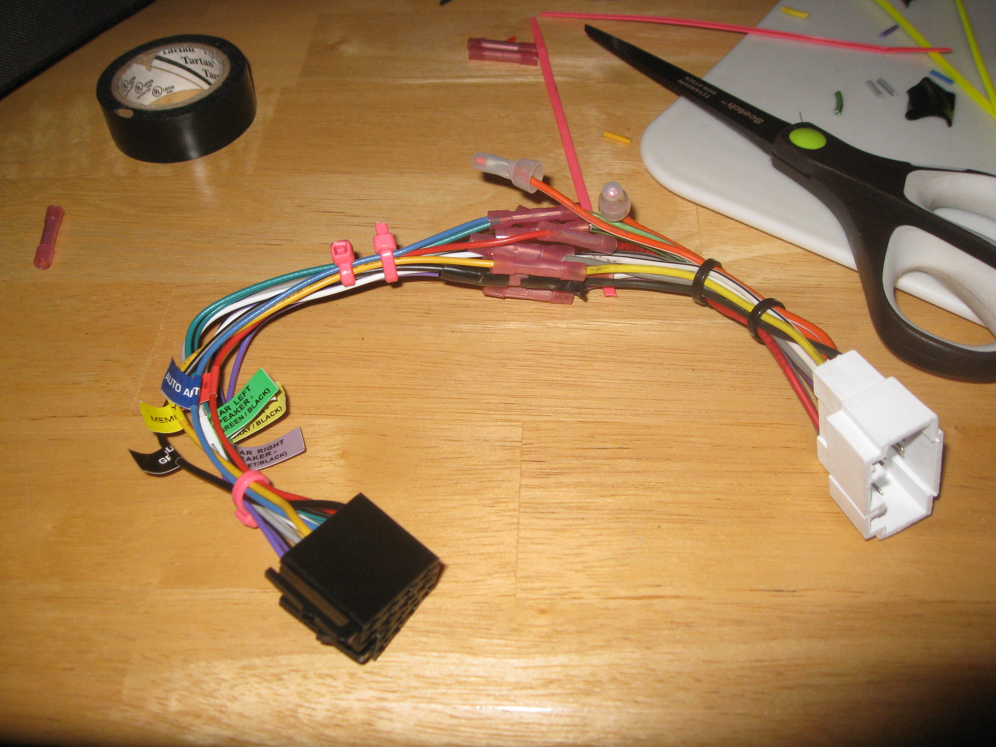 One good DIY success was the new stereo for my Insight. A stereo without an 1/8" stereo miniplug auxillary input is totally unacceptable to me, so I bought one for $54 from amazon.com using a portion of a $200 gift card I earned by doing a survey interview last month. I was tempted to have it installed at a shop, especially when I realized I would have to wire up the wiring harness for this stereo to the adapter for the car, which is an extremely tedious thing. I priced installation as well as new speakers, but ended up doing the whole thing myself. I re-used the existing wiring harness ($21 savings) and just cut the wires where they were crimped. I used regular household scissors instead of wire strippers, and the guy at the car audio store was nice enough to give me a handful of crimps I could use to make the connections. I was able to get the whole thing wired up and installed without too much trouble.