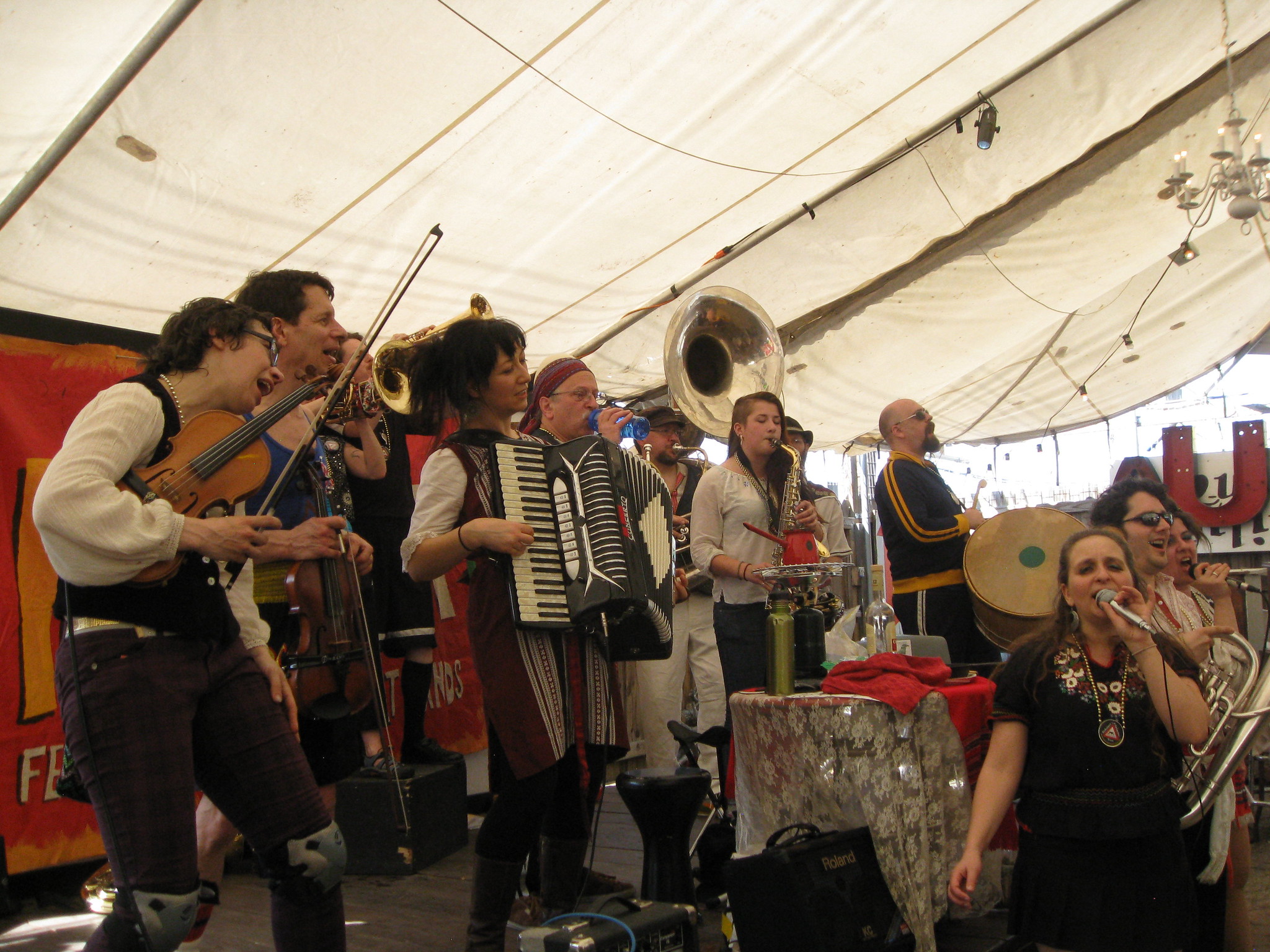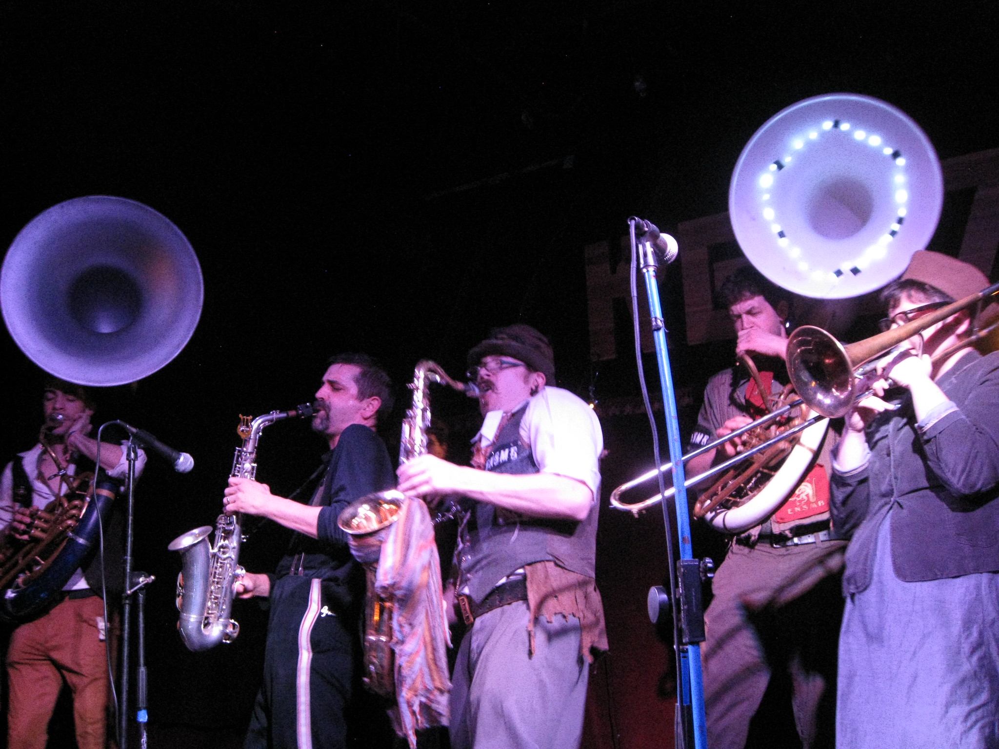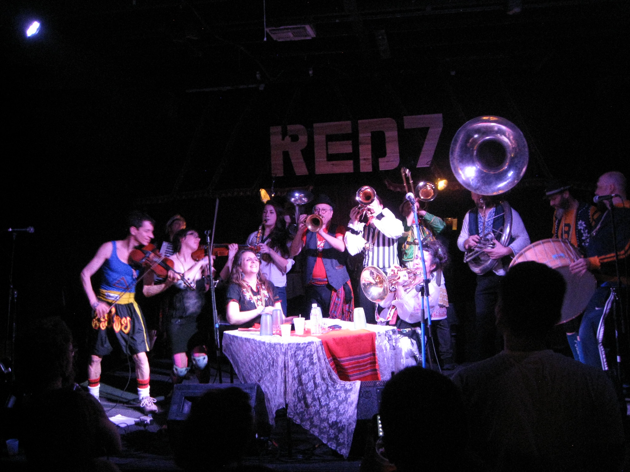 After the parade there were band performances throughout the night at Red 7, alternating between the indoor and outdoor stages. It is common in Austin for venues to have two decent-sized stages, it seems. Most of Gora Gora was in the process of arriving that night and by around 11 PM or so, a quorum of the band was all there hanging out and listening. I particularly enjoyed the set by the Bucharest Drinking Team and how loud some of these bands are without any amplification.