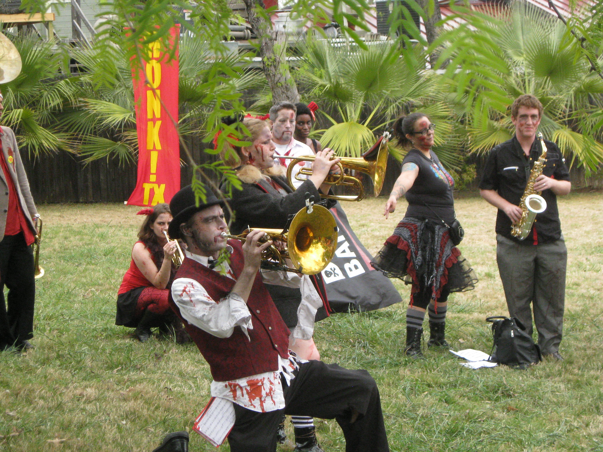 Last Wednesday I flew out to Austin, Texas for Honk!Tx, a festival of community street bands. Shaun from Gora Gora was on my flight and several other honkers toting instruments and megaphones were making connections in Denver and on our same flight. My accommodations for the night were at a hostel in Austin, and a friendly man with a British accent at the airport information desk warned me sternly that it was in an unsafe neighborhood and be careful walking the several blocks from the bus stop to the hostel. Shaun and I took the $1 Capital Metro bus together, and I got off near the hostel. The neighborhood looked mostly fine to me if a bit pedestrian unfriendly. I picked up some hairspray since there happened to be a Walgreens right there. I didn't end up using it since most of my transportation was by bike and I was wearing a mohawk-incompatible helmet.