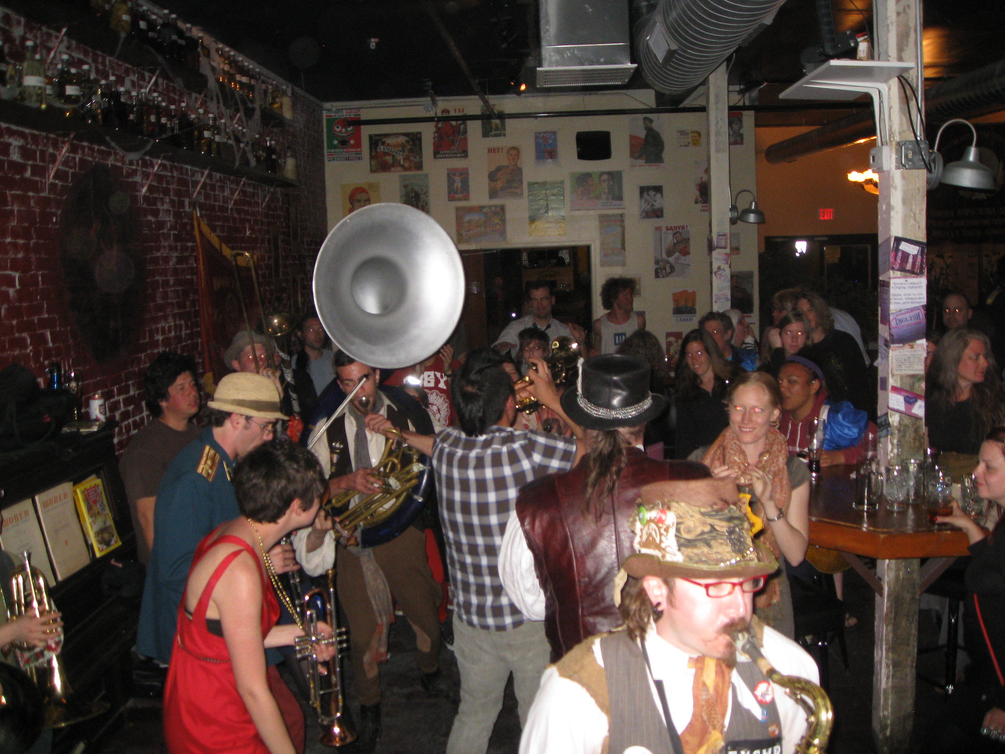 Saturday evening was another pot luck home-cooked dinner and we hung out and had a good time. I think we eventually biked home for a rest before heading to the Russian House to play a late gig from 11 to 1. The Russian House manager (a 9' tall Russian woman) was very supportive of Honk!Tx and had bands playing their Fri/Sat/Sun.